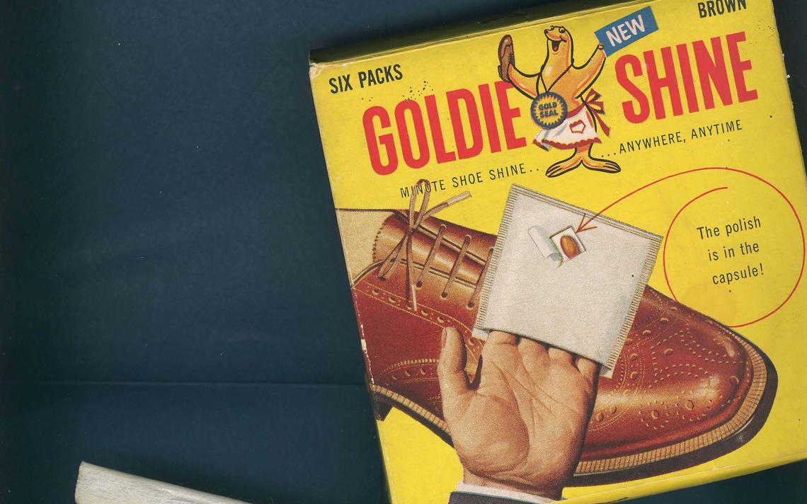In a March 1953 story, The Fargo Forum reported that a new “minute shoe shine,” the “brainchild” of a Fargo resident, was now “rolling off the production line in Chicago.” Goldie Shine would be available in packs of six, retail for 5 or 6 cents for each mitt and come in brown, black or neutral. Ads for Goldie Shine appeared in newspapers in markets across the nation.