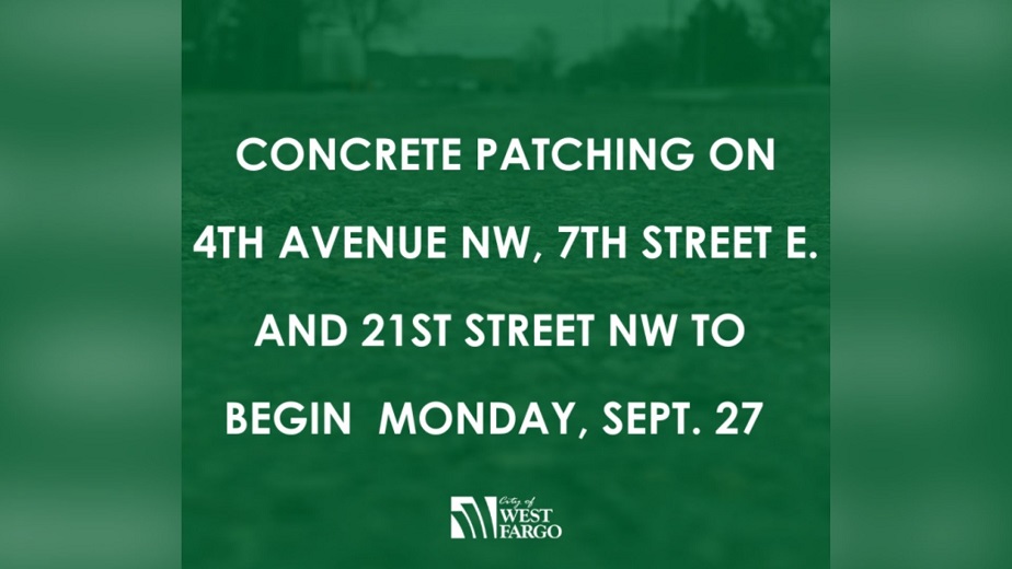 West Fargo, North Dakota – On Monday, September 27th, concrete patching work will begin on parts of 4th Avenue NW, 7th Street E., and 21st Street NW.